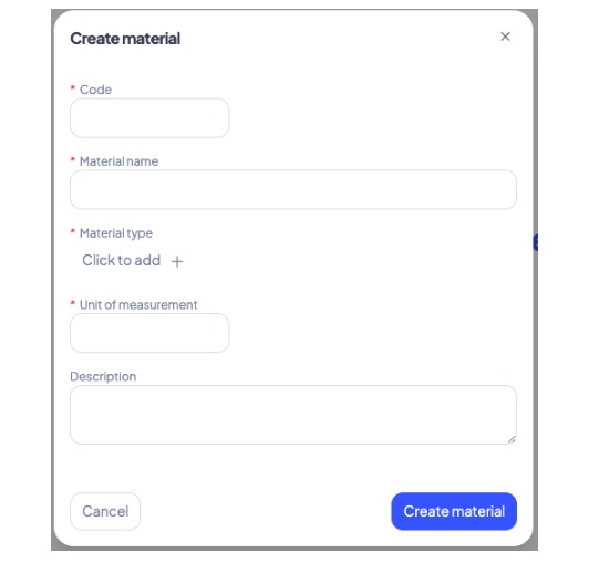 - To create a material, you'll need to fill in the following fields to provide additional contextual information: