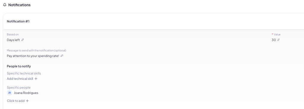 - Specify who should be notified when budget thresholds are reached and define the notification rules (e.g., notify User A when 75% of the budget is spent, notify User B 5 days before the end of the period).