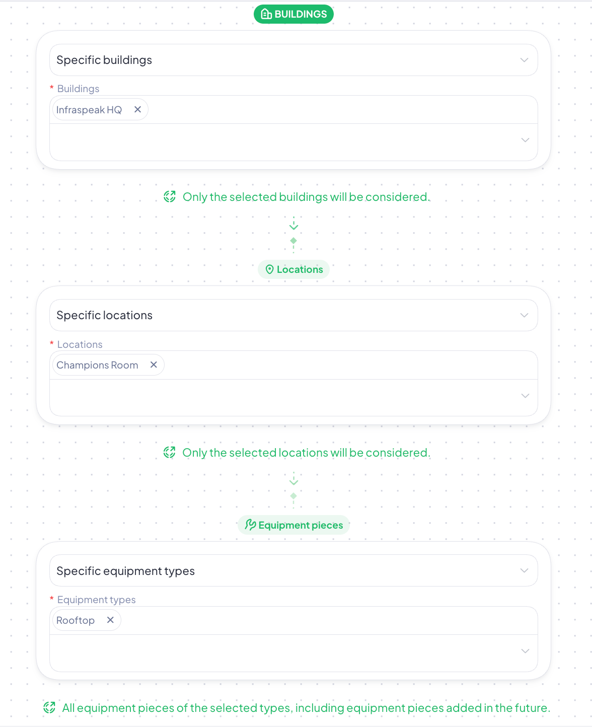 4. In the example below, by choosing Specific Buildings and picking the one I wanted to narrow down this automation to, I could then only pick specific locations from Infraspeak HQ and equipment types from the Champions Room.