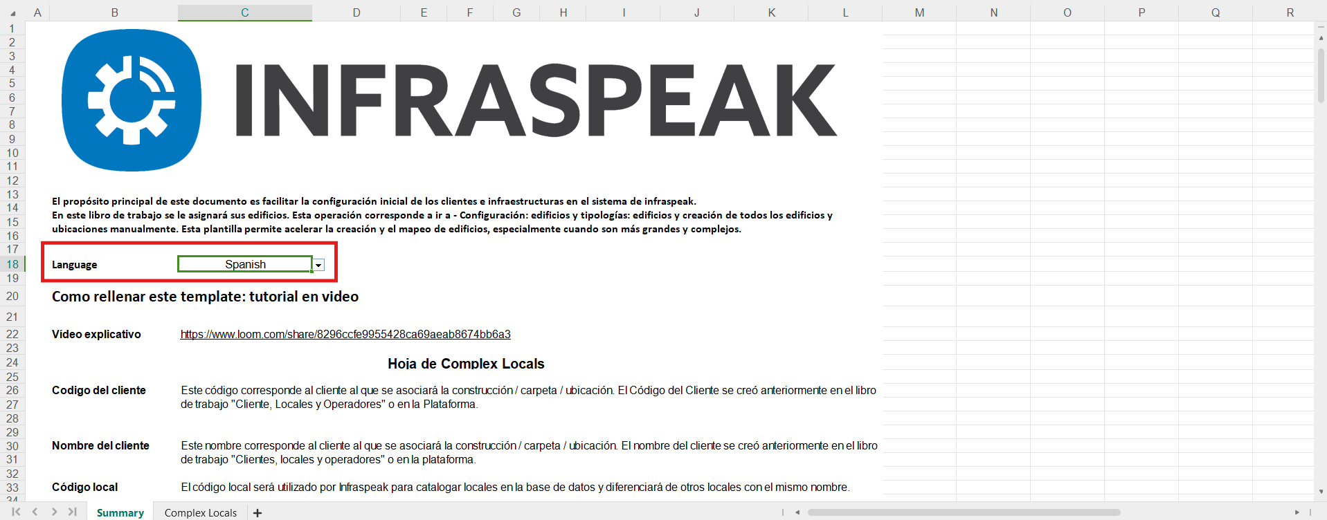 - A continuación, dirígete a la planilla Excel de "Complex Buildings", que deberá estar ya totalmente cumplimentada y lista para ser cargada, y valida el idioma, garantizando que coincide con el del sistema.