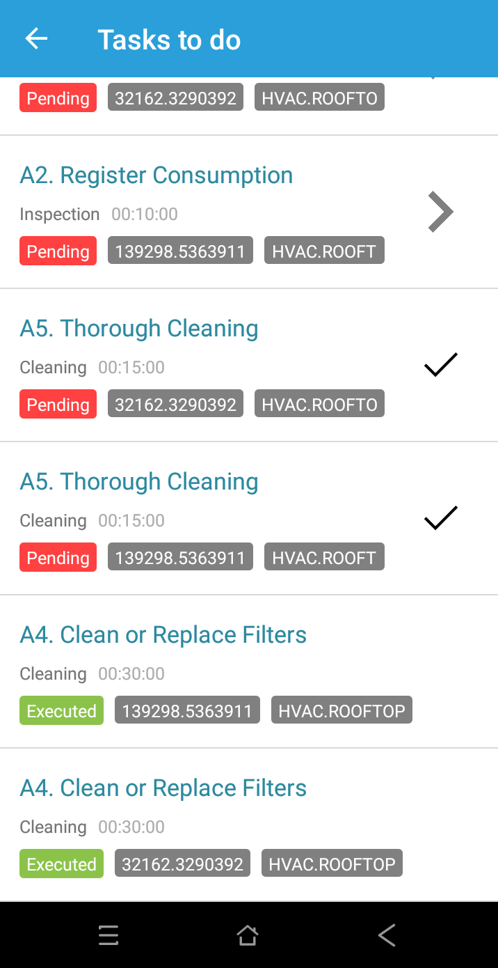 8. Depois de selecionar a manutenção preventiva, você verá as tarefas a serem executadas. As tarefas existentes são compatíveis, então você não precisa inserir cada uma delas. Você pode simplesmente completá-la clicando no ícone de verificação.