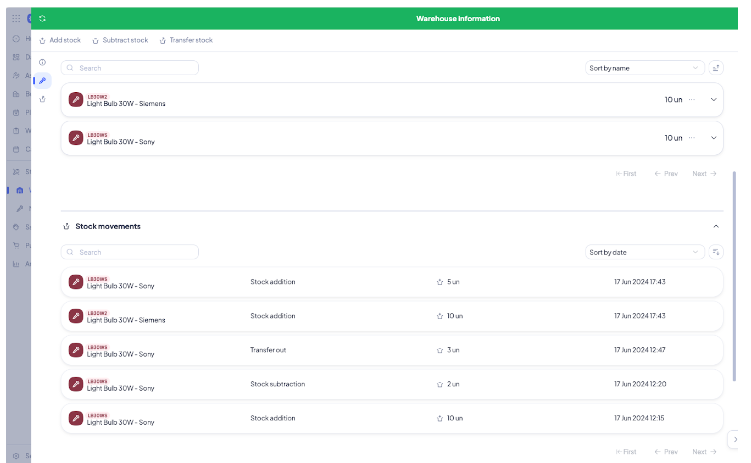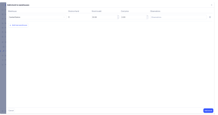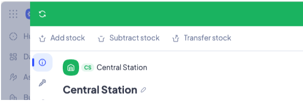 - No topo, você tem a opção de adicionar, subtrair ou transferir estoque. Como está atualmente vazio, adicionaremos alguns itens ao nosso almoxarifado “Estação Central”.