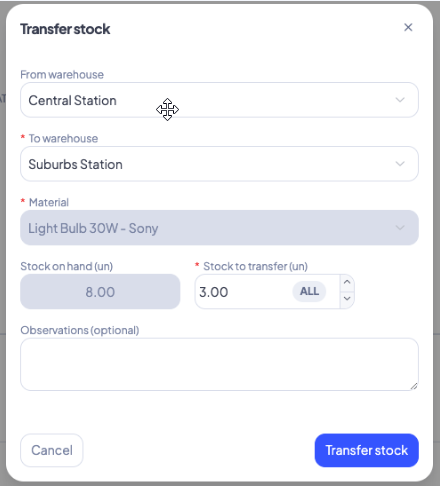 - Finalmente, você também pode transferir materiais de um almoxarifado para outro. Imagine que a Estação dos Subúrbios precise urgentemente de 3 lâmpadas, e vamos enviá-las do nosso estoque da Estação Central. Isso pode ser facilmente feito usando a opção “Transferir Estoque”: