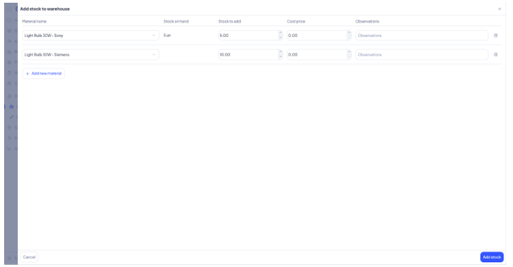 - Neste caso, você pode realizar as ações de “Adicionar Estoques” e “Subtrair Estoque” para uma lista de materiais.