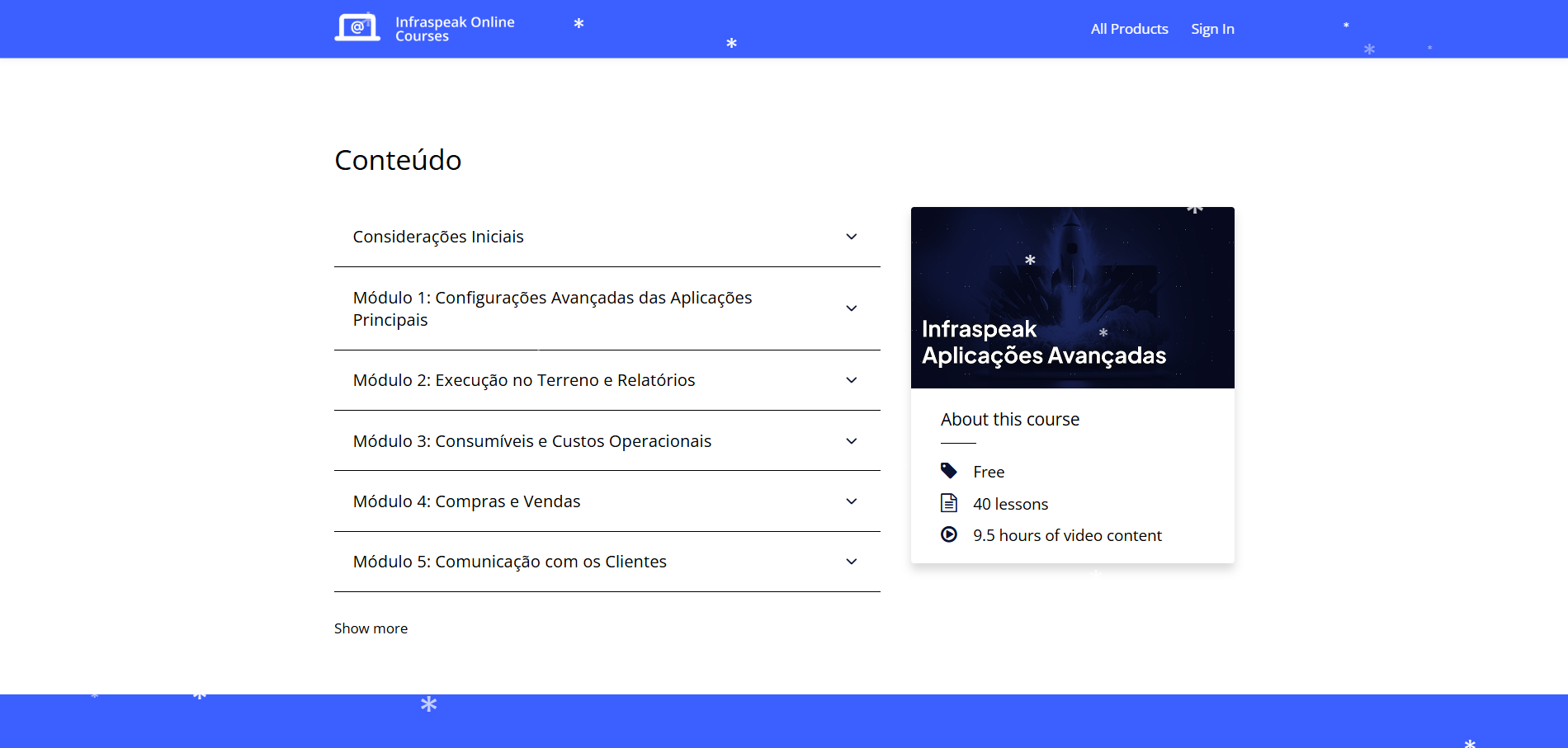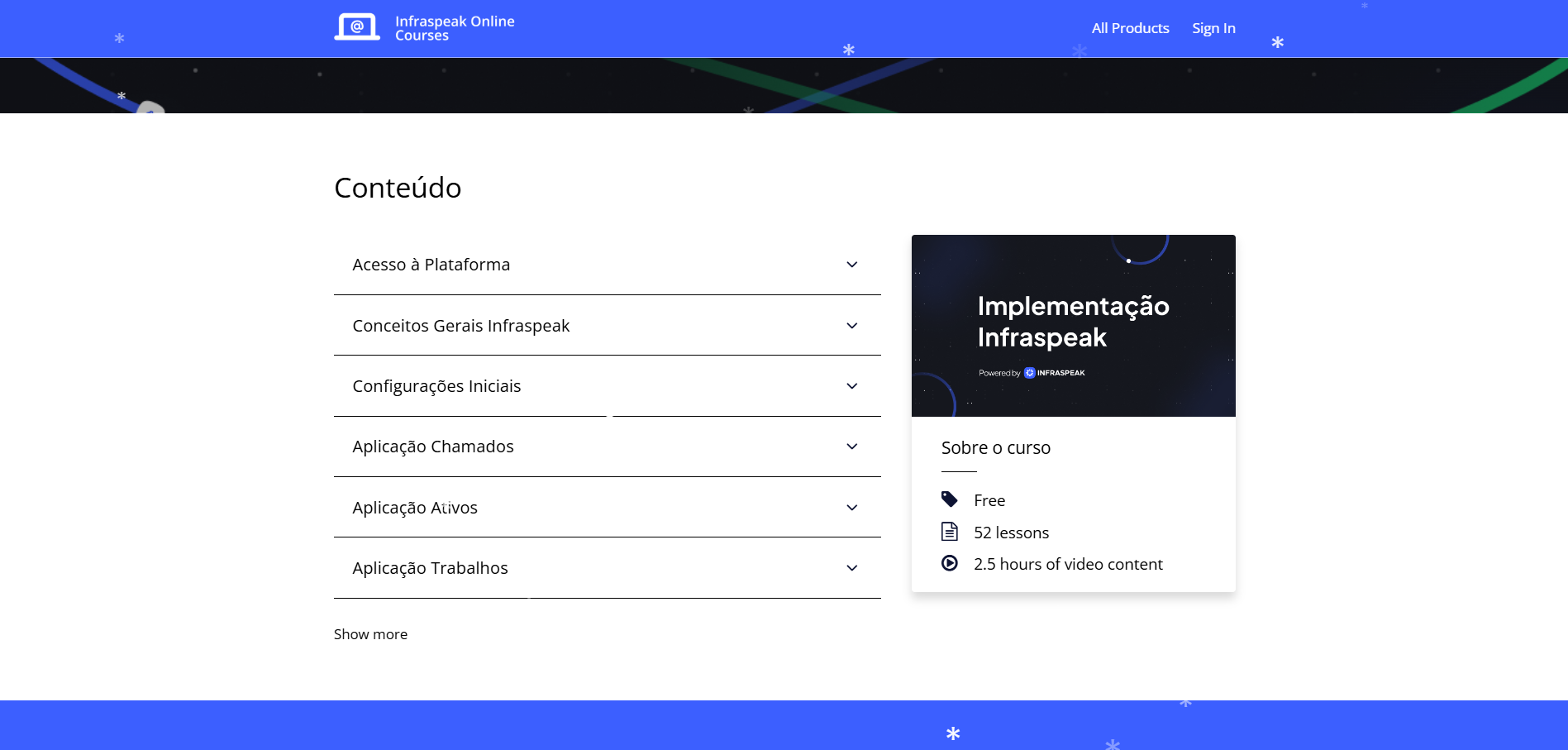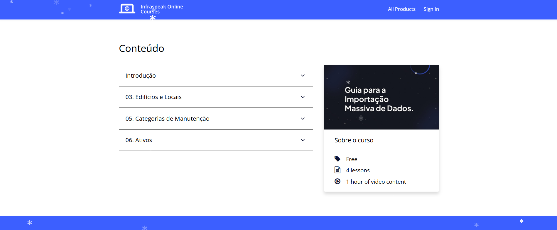 Este curso tem tudo o que você precisa para começar com o Infraspeak. Em 52 lições com 2 horas de conteúdo em vídeo, você aprenderá como configurar seu ambiente, tudo sobre manutenção corretiva e preventiva, e gestão de ativos. Aqui você também pode encontrar manuais do usuário para o Infraspeak Mobile App (Técnico).