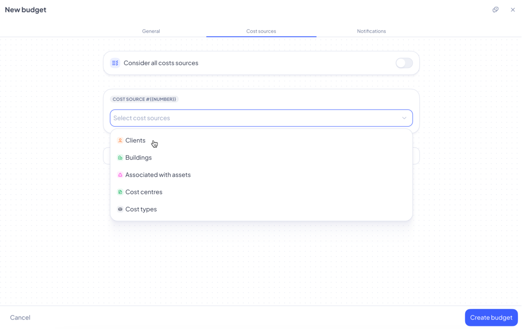 - Selecione os Custos que devem ser incluídos neste orçamento. Os utilizadores podem combinar custos das seguintes fontes: centro de custo, associação (Pedidos, ocorrências, adicionadas a ativos, outras ações), Cliente, Edifício, Tipo de Custo (materiais, serviços, mão de obra, outros custos).
