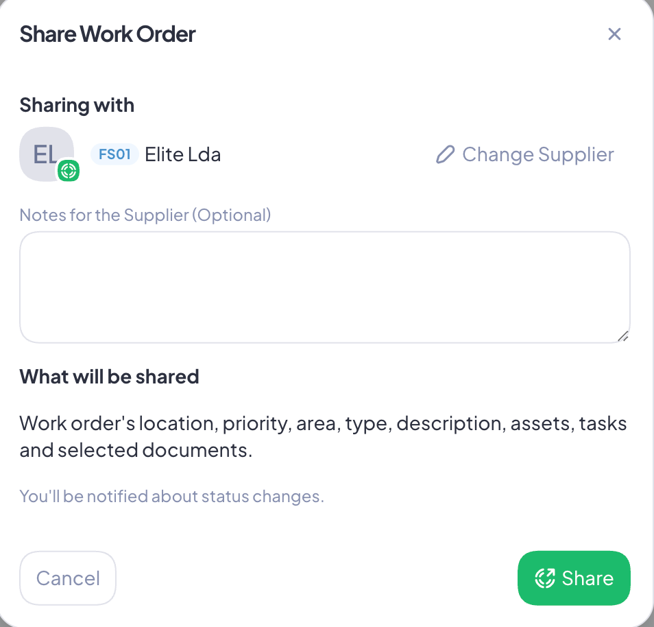 Quando partilha um Pedido ou Trabalho Planeado com o seu Fornecedor, os edifícios, localizações e equipamentos associados aos mesmos serão também partilhados. Isto pode ser visualizado durante o ato de partilha nos seguintes ecrãs:
