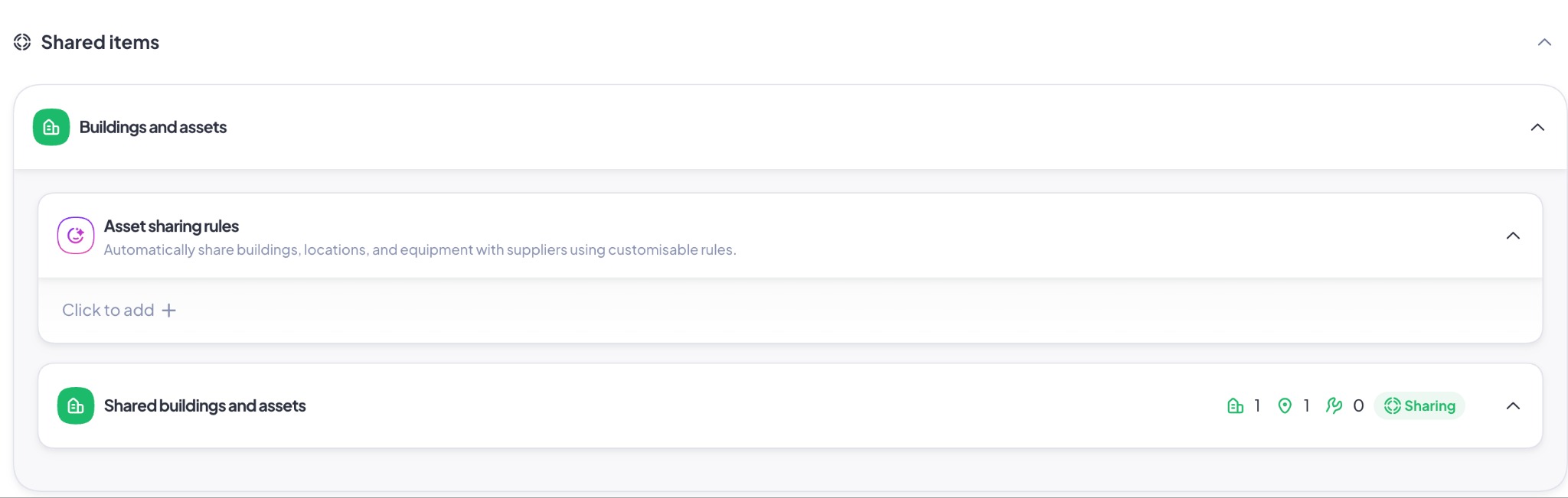 4. Neste menu, verá três regras que pode definir para a partilha de ativos: para edifícios, localizações e tipos de equipamento. Isto é concatenado, o que significa que as regras definidas para edifícios terão impacto nas localizações, e as definidas para localizações terão impacto nos tipos de equipamento.