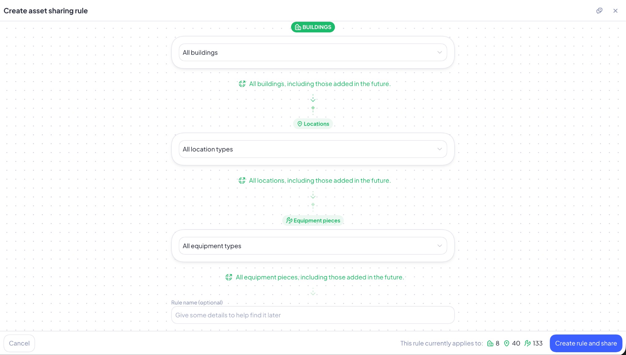 6. Após concluir a sua seleção de edifícios, localizações e tipos de equipamento específicos, verifique o rodapé deste ecrã. Pode cancelar o progresso feito até agora ou premir Criar regra e partilhar para começar a partilhar ativos automaticamente com o seu cliente.